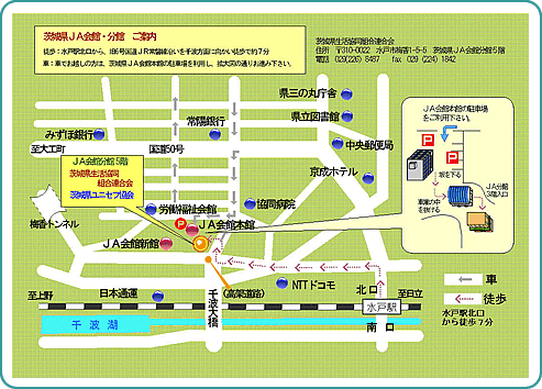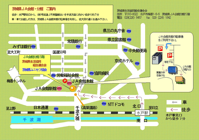 お車でお越しの方は、茨城県JA会館本館の駐車場を利用し、拡大図の通りお進みください。