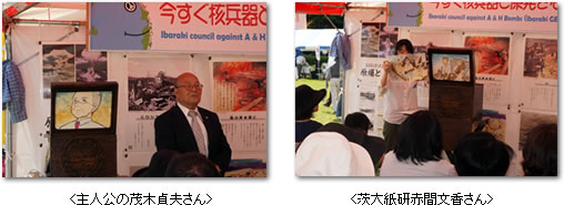 5月3日(水)水戸市千波湖はなみずき公園の憲法フェスティバル会場において、茨城県原水協より依頼を受けて、紙芝居「茂木貞夫物語」の上演と、原爆パネル展を開催しました。会場のテントは満席で、35分の紙芝居を熱心に観賞していただきました。また紙芝居の主人公の茂木さんが紙芝居につての感想を述べました。