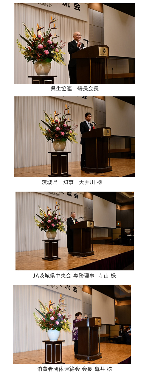 大井川和彦様からは、「日頃から生協をはじめとする協同組合には県民の安心・安全のために、食を中心に地域見守りや高齢社会に対する福祉・助け合い、困窮世帯への支援など広く県民のくらしを支えて頂いていることに感謝します。引き続き県行政として、県民の豊かなくらしの実現にさまざまな施策を打っていきます」。JA中央会 専務理事