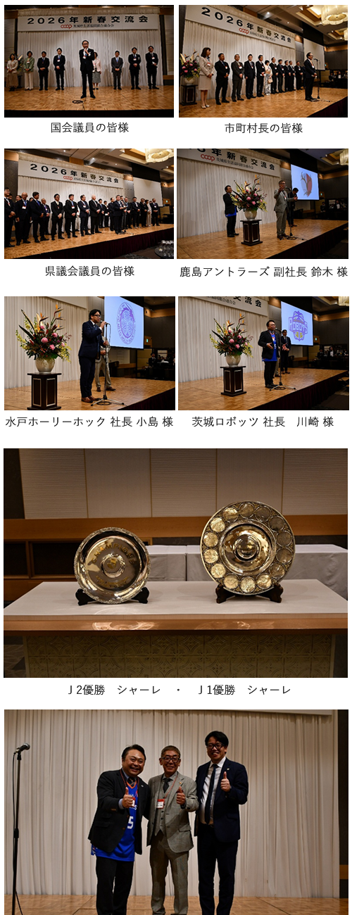 今回の交流会では、茨城県内のプロスポーツ団体を代表して、株式会社 鹿島アントラーズ様、株式会社 水戸ホーリーホック様、株式会社 茨城ロボッツ・スポーツエンターテイメント様にご臨席ただきました。会場内にJ1優勝 シャーレ、J2優勝 シャーレをお持ちいただき、参加者からは「記念にも記憶にも残る写真が撮れた」と大変好評でした。