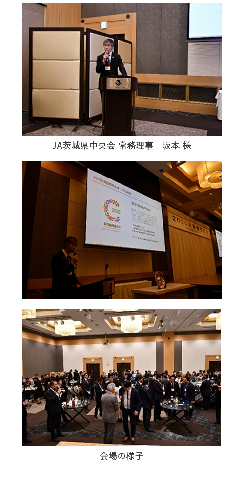正史様からは、「2025国際協同組合年を通して新たに生協や他の協同組合との連携が大きく前進し、農業と食が抱える課題についてさらに生産者と消費者の相互理解を深めていきます」とお話をいただきました。乾杯のご発声は、茨城県消費者団体連絡会 亀井
